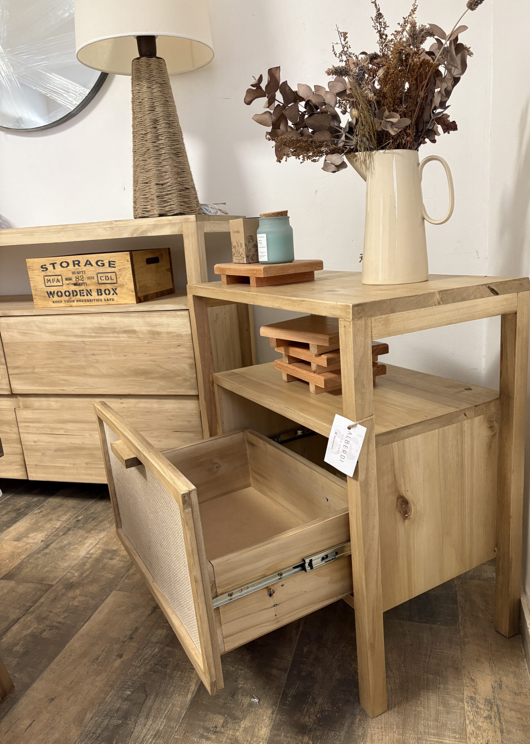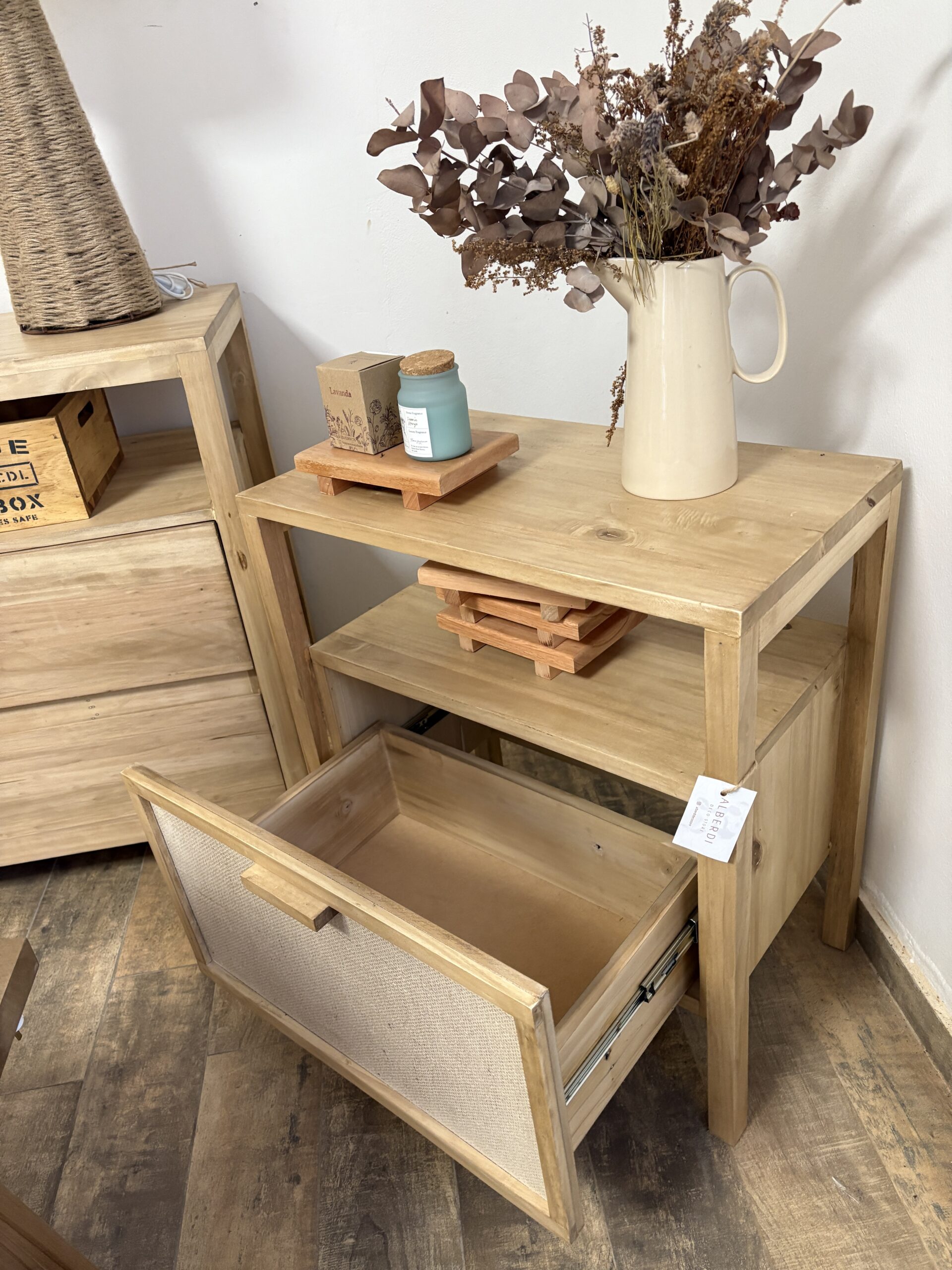 Cajón entelado con yute premium y correderas metálicas.